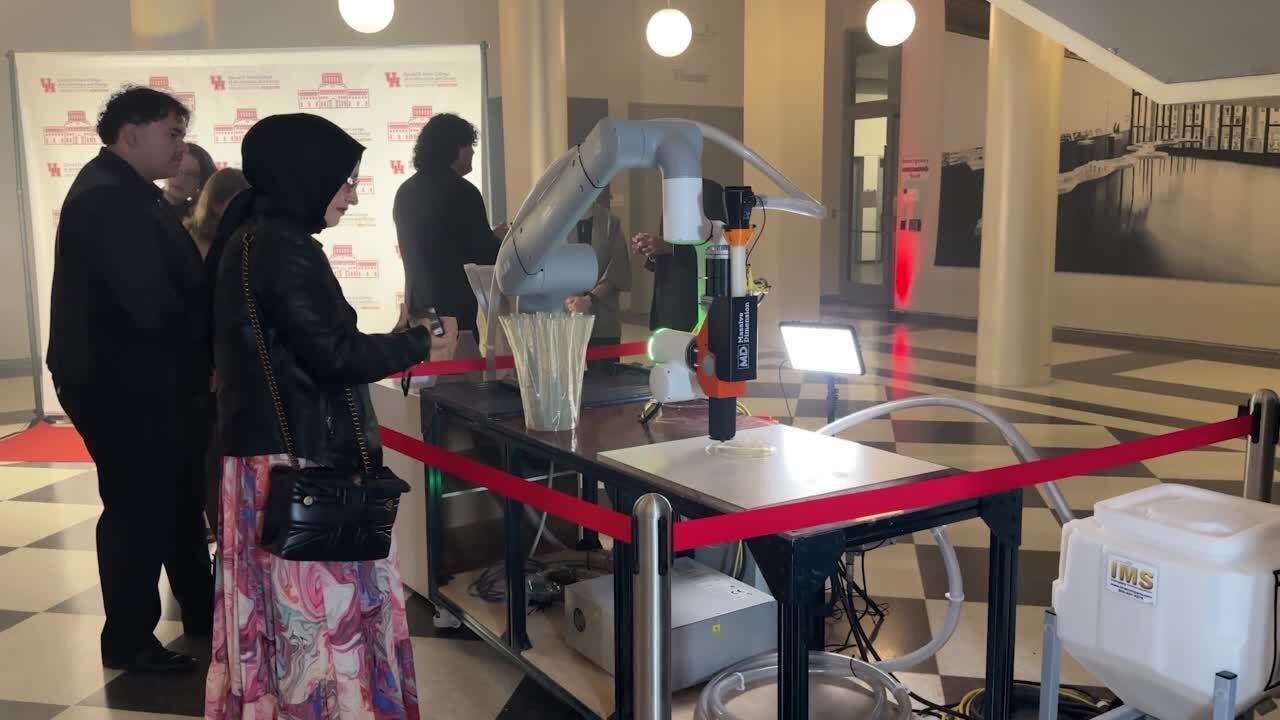 A highlight of the evening featured a live demonstration by Andrew Kudless (Bill Kendall Memorial Endowed Professor of Design Technologies) and Chris Battaglia (Assistant Professor of Emerging Construction Technologies and Presidential Frontier Faculty). The duo showcased the College’s robotic arm as it 3D-printed a sculptural vase in real time, giving guests a glimpse into the future of construction robotics now taking shape at the Hines College.